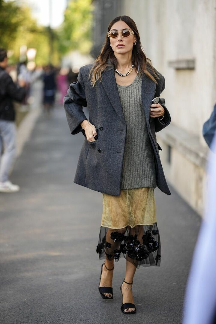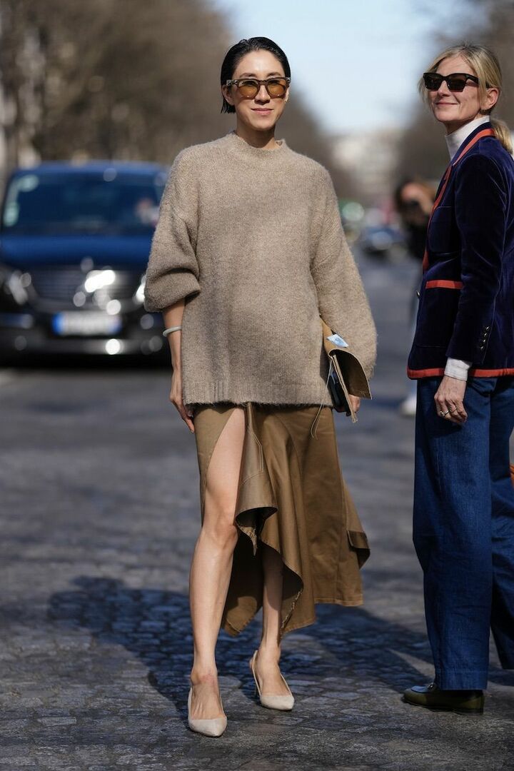 オーバーサイズニットとフレアパンツ、ショルダーバッグとバレエシューズのコンフォートな着こなしも、グレーと黒のシックな色合わせならルーズに見えません。さらにニットのサイドスリットがキレのよさに貢献。ヘアをタイトにまとめたこともバランスアップに作用しました。