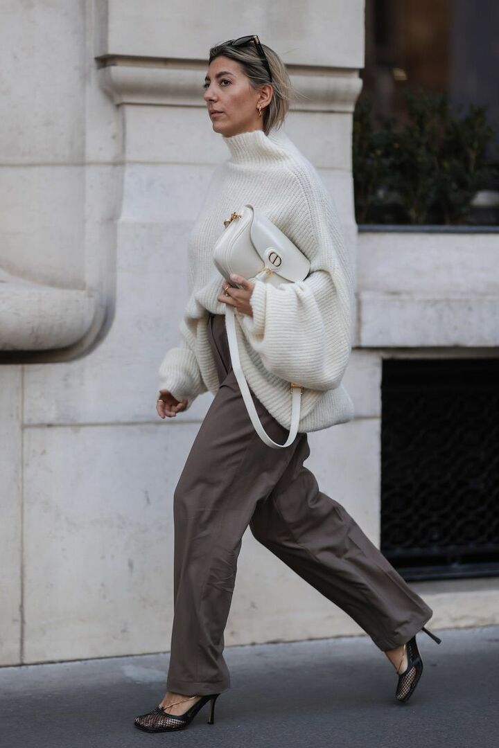 クリーミーな白のオーバーサイズニットとベージュパンツのニュアンスカラーコーディネート。レザー素材のパンツにニットをタックインして、緊張感を宿せばぼんやりしません。さらにフィット感のあるシューズと端正なバッグの黒小物で締めるとメリハリしっかりに着地。