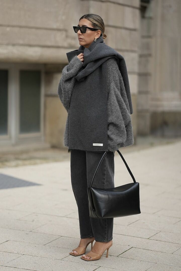 ゆったりニット×ワイドデニムパンツの着こなしは、濃淡をつけたグレーに任せてスタイリッシュさを獲得。プレーンなストールをラフに垂らし、Iライン効果をプラスすればすらっと見えます。ツヤのある黒バッグを携え、さらに引き締めて。