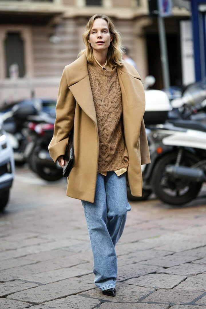 全体的にゆったりした着こなしは、ウールコート、シャツ、立体感のあるケーブルニットをレイヤードして奥行きを確保。ポインテッドトゥパンプスやクラッチバッグの黒小物を加えれば、スマートさが備わってぼんやりした印象に陥りません。