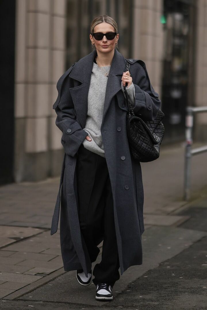 親近感のあるオーバーサイズニットを都会的に仕上げるなら、モノトーンで構成してみて。コートをゆったりシルエットで統一し穏やかな迫力を宿せば、かえってモード感を強調することができます。足元に小さく白を効かせ、重くなるのを防止。