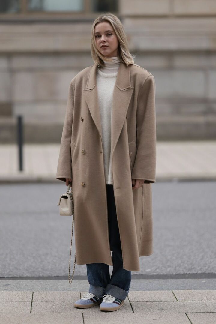 オーバーサイズニットがかさばらないよう、ゆったりしたサイズのコートをセレクト。上品なベージュチェスターも、余白のある形ならこなれ感たっぷり。白タートルネックトップスを忍ばせ、さらにパンツとスニーカーはブルー系でまとめクリーンさを演出しました。