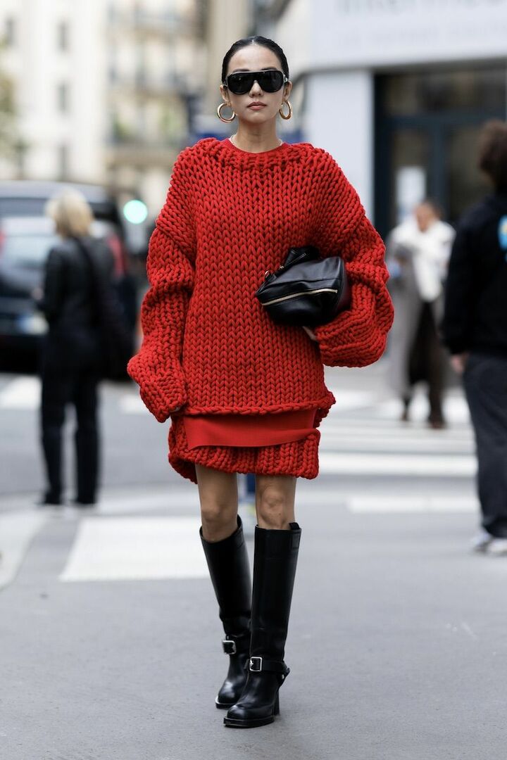 バランスが計算されたオーバーサイズニット×ミニスカートのセットアップは、キャッチーな赤が着映え力を加速してくれます。タフな黒小物を添えれば、力強い配色になり意志ある佇まいに。