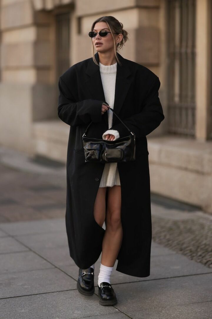 ゆったりとした形を活かし、オーバーサイズニットをミニワンピース風にアレンジ。パワーショルダーがモードなロングコートでレッグラインをカバーすれば美バランス。シンプルなモノクロ配色のなかで、靴下とローファーのプレッピーな足元がよく映えて。
