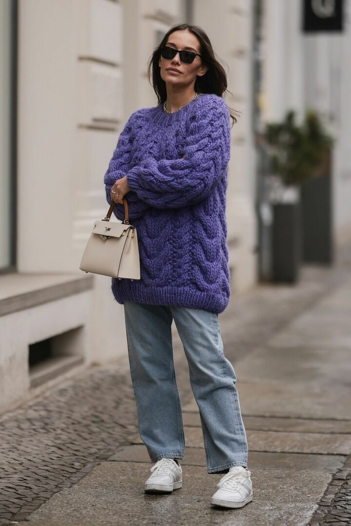 オーバーサイズニットはカジュアルなコーディネートと親和性が高いです。発色のよいパープルのゆったりニットには、程よい余白を残したライトブルーストレートデニムパンツを合わせ穏やかなメリハリをオン。白スニーカーがあれば軽やかさが盛り上がります。仕上げにしなやかなライトベージュのレザーバッグを添え、都会派カジュアルを完成させて。