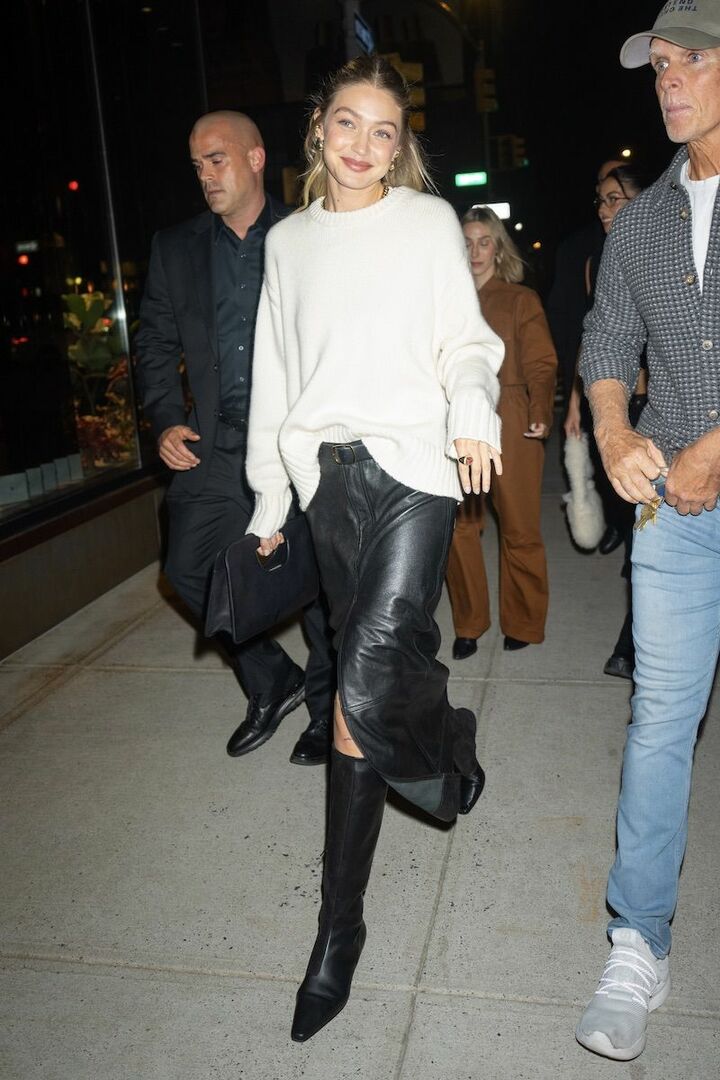 汎用性の高い白のオーバーサイズニットを着用していたジジ・ハディッド。ニットが膨張しないよう、ボトムはすっきりさせるのが着映えへの近道。黒レザーでリンクしたIラインスカートとロングブーツのコンビで、スタイリッシュさも両得。さらにニットのフロントのみインすると抑揚が生まれます。