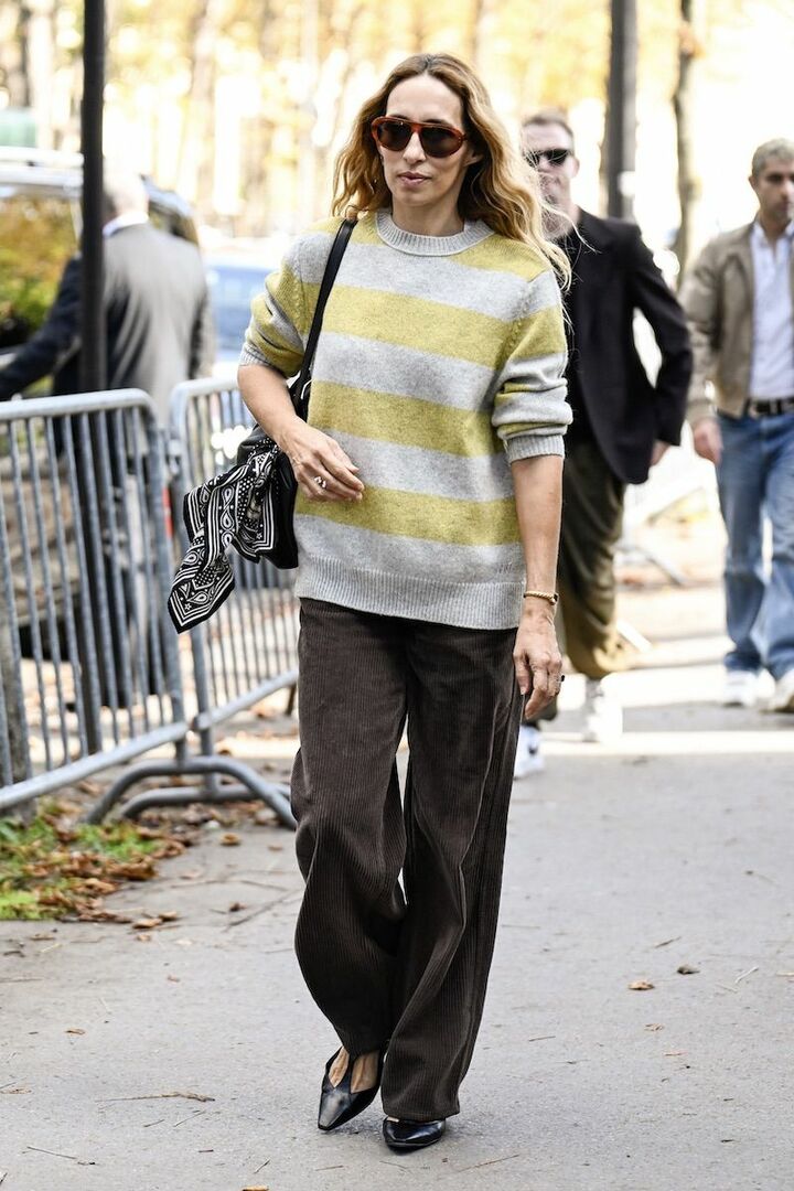ゆったりシルエットの上下でもラフにならないのは、ボーダー柄ニットとコーデュロイパンツによって立体感を意識し、オーバーなシルエットを目眩しさせているから。グレー、ブラウン、黒のなかでくすみイエローが映え、大人ならではのカラースタイルが完成。プリントスカーフをバッグにあしらい、さりげなく柄×柄にしているのもお見事。