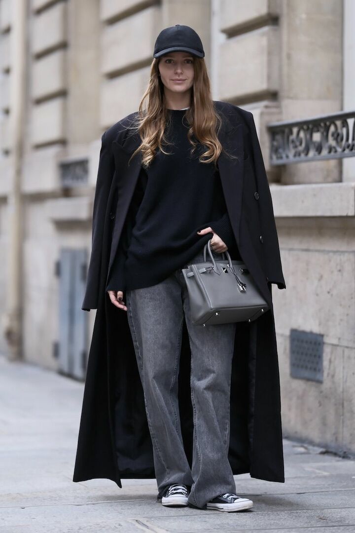 キャップ、ニットプルオーバー、デニムパンツ、スニーカーのカジュアルコーディネートは、オーバーシルエットにしてリラックス感を助長。黒を基調としたながら、ゆとりのあるコートを肩掛けして格好よさをアピール。スニーカーの白が軽やかさをクリアし、好バランスに着地。