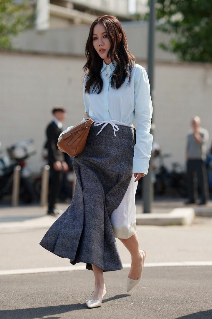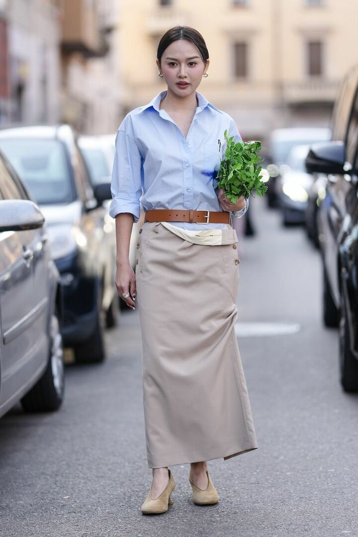 ベージュのスカートとパンプスがあれば、水色シャツの上品さがアップ。Iラインのスカートがスマートな印象を叶えます。スカートのウエストを折りつつ、印象的なベルト使いでひねりを加えモード心を刺激。