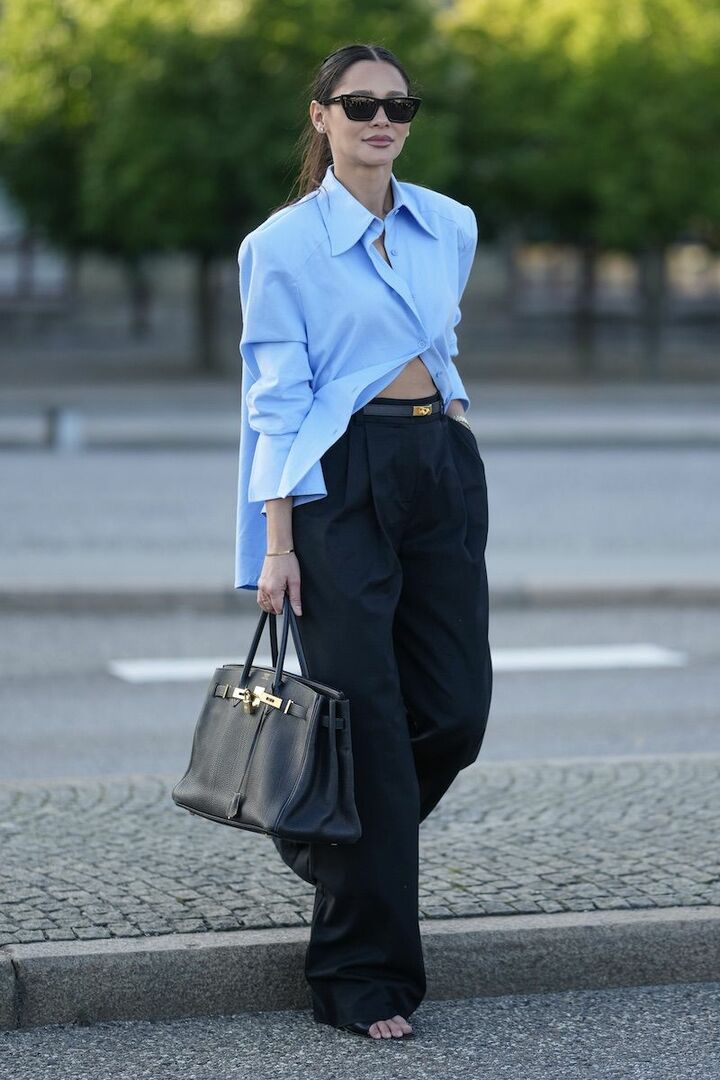 ビッグシルエットのシャツを、ミニワンピース風にアレンジしたケンダル・ジェンナー。好印象な水色のストライプならヘルシーさが際立って。端正な黒のボストンバッグとローファーを投入し、爽やかなカラーを引き締めて都会的にまとめました。