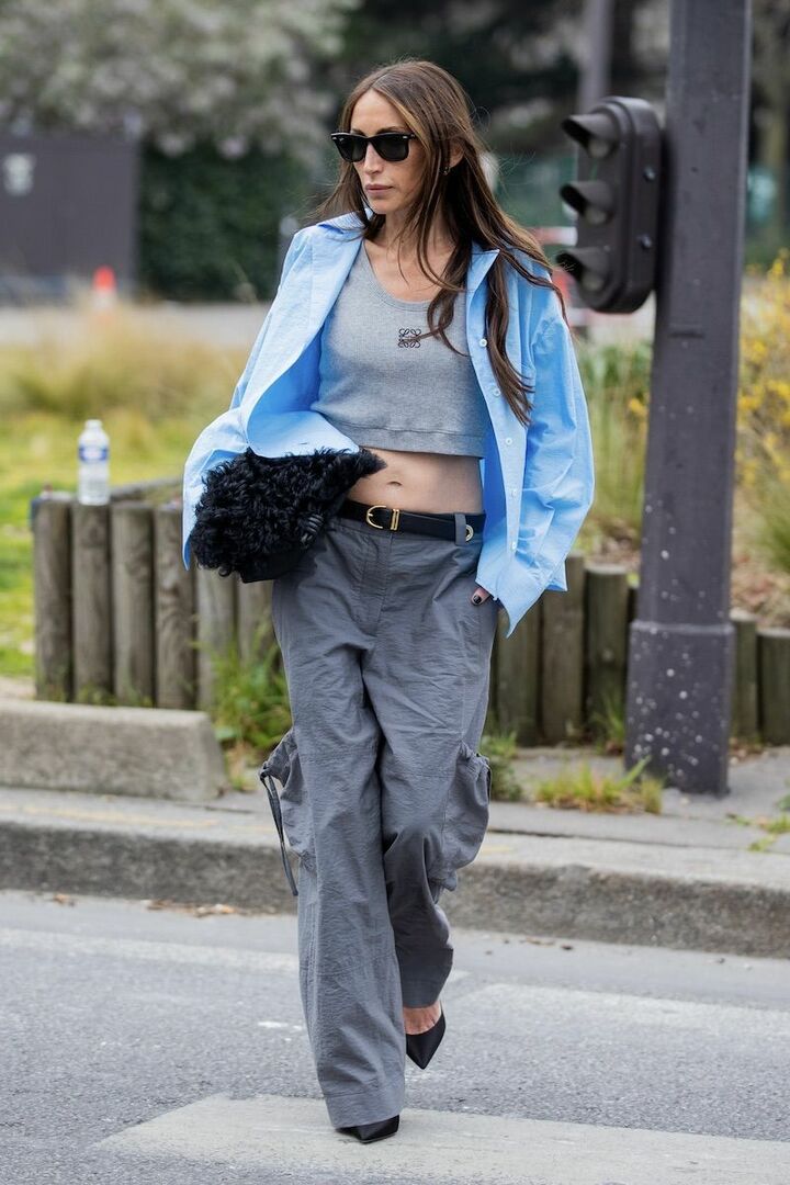 グレーの色味を変えたクロップドタンクトップとカーゴパンツのアクティブなコンビに、水色シャツをふわっと重ねて躍動感を演出。スタイリッシュな配色と肌見せが切れ味として作用。