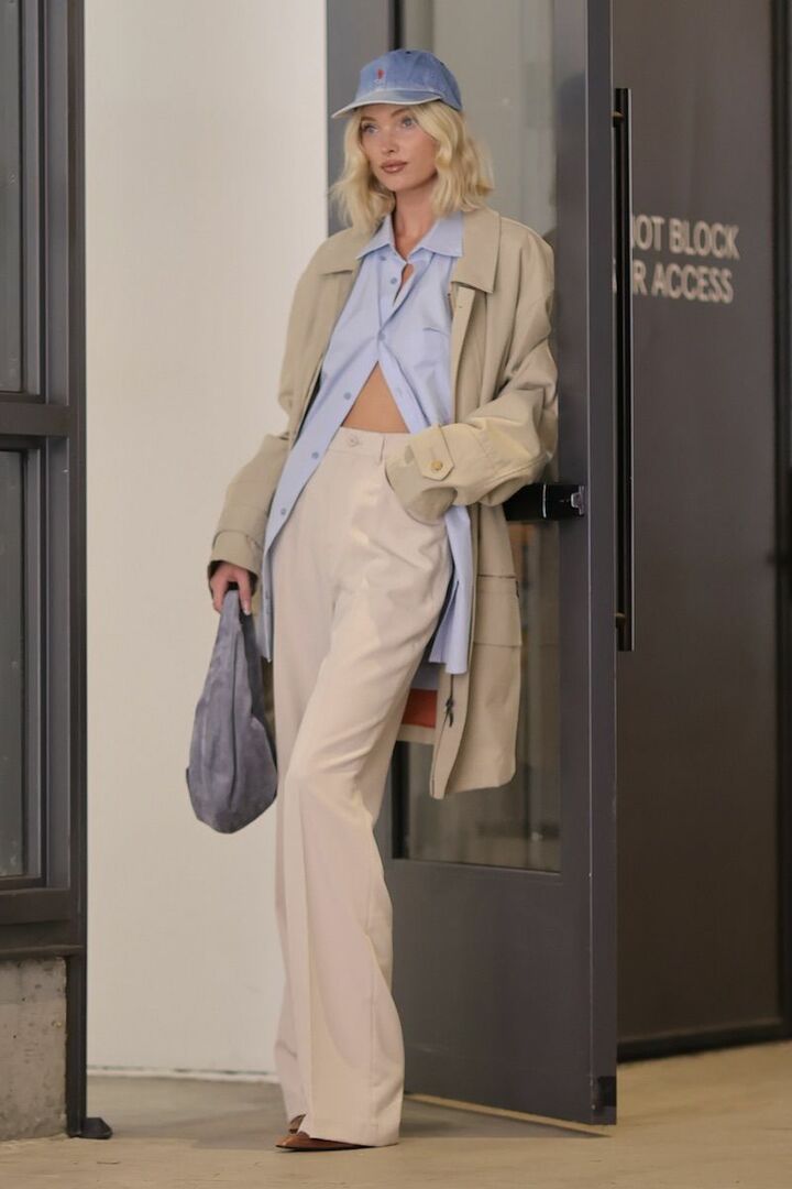 クラシカルなベージュトレンチコートに、それよりも薄い色味のパンツを合わせ、セットアップ風スタイルを作っていたエルザ・ホスク。色調を揃えた水色シャツを仕込み、透明感を放って。ボタンをラフに留め、お腹周りに三角ゾーンを出現させればキレのよい表情に。シャツよりも濃いキャップを投入し、穏やかなメリハリを授けました。