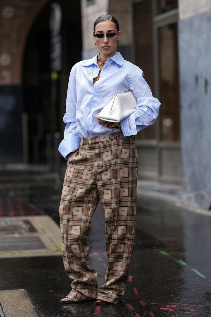 細かなチェック柄が扱いやすいくすみブルーのセットアップは、シャツを腰に巻いてあえて着崩すと新鮮な印象に。繋がりがよくなるよう、トップスは水色シャツをセレクトし調和の取れた着こなしを完成させました。