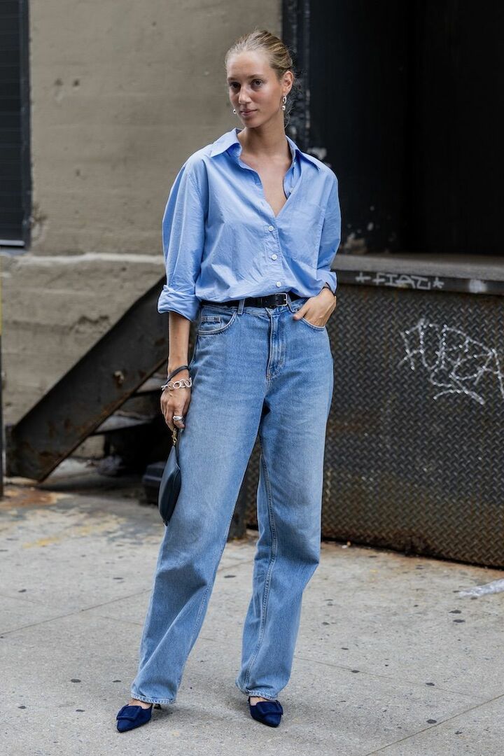 シャツとデニムパンツの王道きれいめカジュアルは、クリーンな水色を頼りに清潔感を後押し。黒のベルト、ネイビーのバッグとパンプスを差してバランスよく引き締め。水色の涼感を引き上げるシルバーアクセサリーが好アクセント。