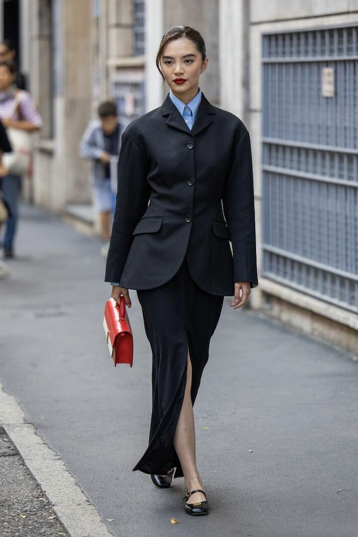 ウエストがくびれたジャケット、微光沢感のあるフロントスリットスカートを選び、黒でまとめた上下がのっぺりしないように調整。爽やかな水色シャツをちらりと覗かせ、清潔感をプラス。鮮烈な赤のルージュとバッグが華やかさを添えます。