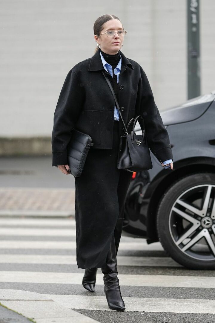 オールブラックコーディネートは、ツヤのある小物を頼りにしてのっぺり見えるのを阻止。さらにタートルニットとジャケットのあいだに水色シャツを挟むだけで、黒のなかに奥行きが生まれます。モードなブラックも、どこか親しみやすい印象に。