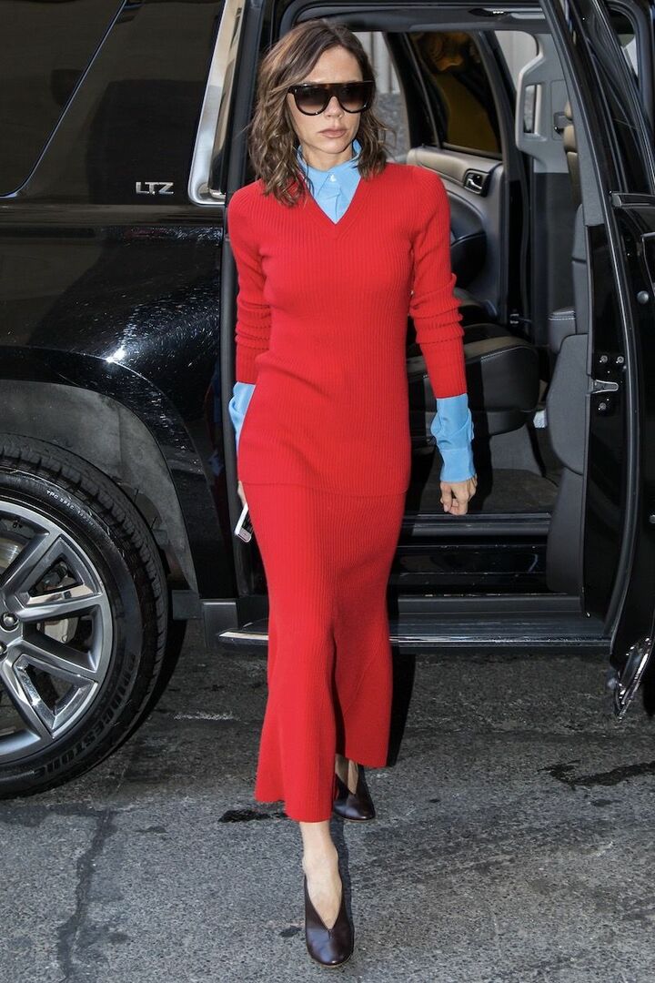 単体でもインパクト十分な赤ニットワンピースを着用していた、ヴィクトリア・ベッカム。さらに水色シャツを仕込んでカラーブロックにし、モード感を倍増させると上級者なオーラが漂います。こっくりビターブラウンパンプスで、品のよさを意識しているのがさすが!