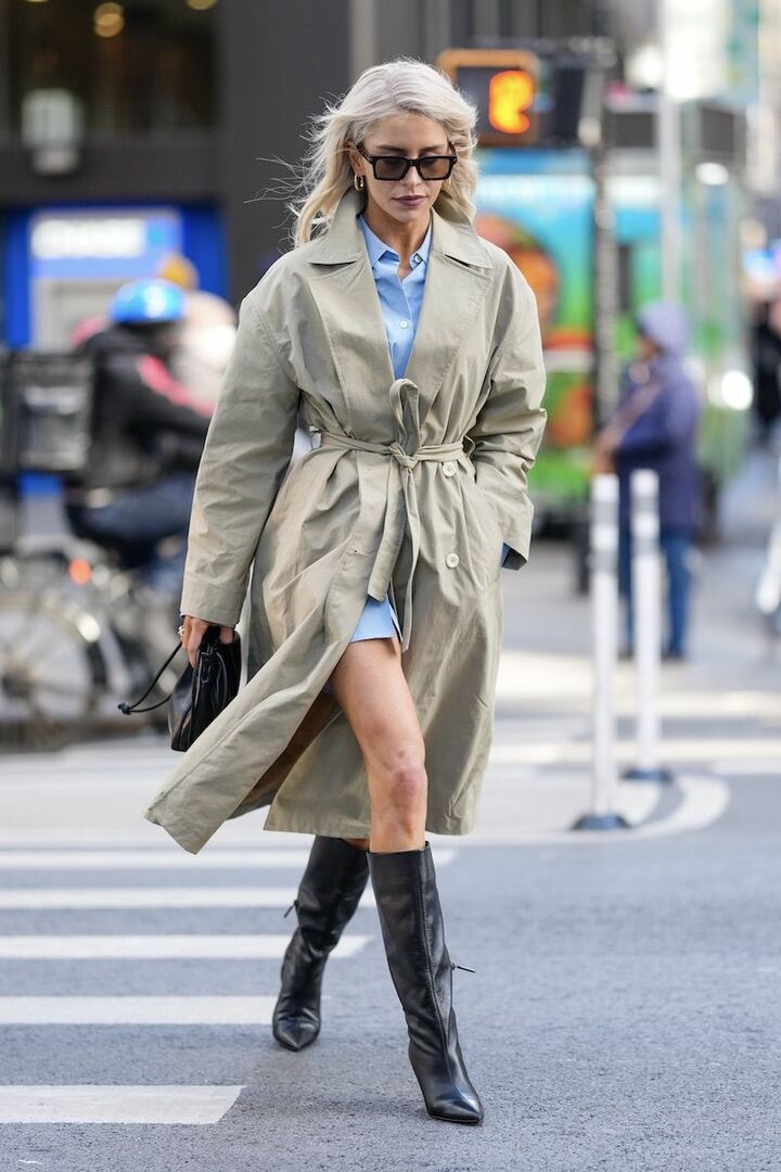 水色のビッグシャツとベージュトレンチコートのワントーンコーディネートは、コートを共布ベルトでウエストマークしてメリハリシルエットを形成するとぼんやりしません。爽やかで上品な着こなしに、辛口な黒レザー小物をプラスして抑揚をつけました。