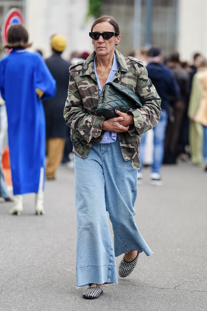 水色とグリーンのナチュラルな色合わせは、ストライプシャツとカモフラージュ柄ジャケットのレイヤード術でインパクトを生み出し、物足りなさを解消。ワイドデニムパンツが抜け感をプラスしてくれるため、スタッズシューズを盛り込んでもトゥーマッチになる心配がなし。
