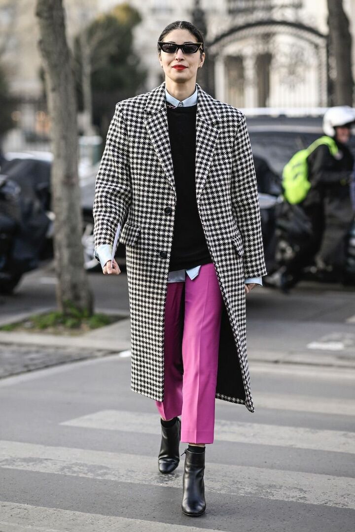 ぱきっとした高発色のピンクパンツと水色シャツでもくどくならないのは、黒ニットをレイヤードして水色の面積を抑えめにしているから。千鳥格子柄のコートとストレートパンツが相まると、エレガントにまとまります。