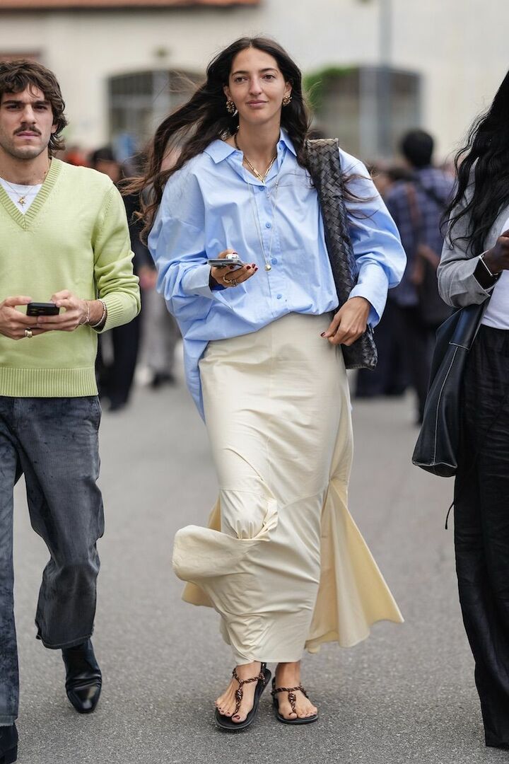 ベージュやホワイトの延長感覚で使えるクリームイエローのスカートを選択し、水色シャツとの一体感を意識。シャツの裾をラフにインして、こなれ感をアピール。フラットサンダルで足元をリラックスさせ、エフォートレスな空気感をまといました。
