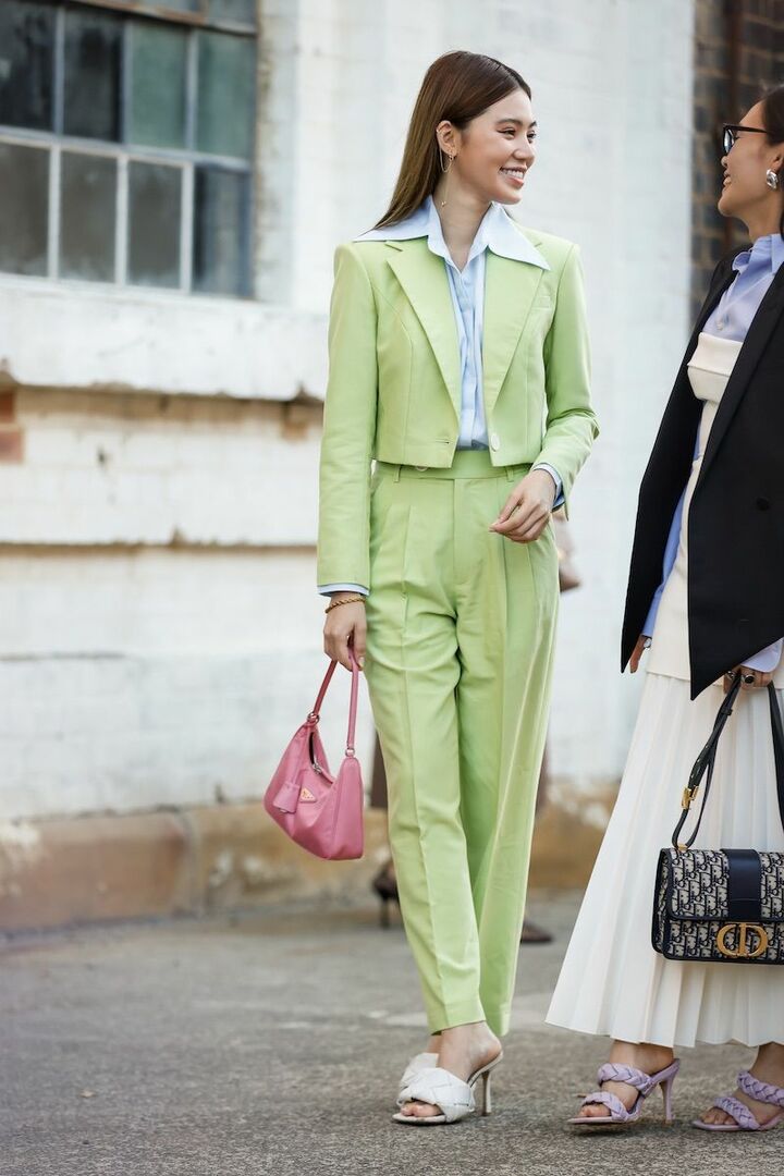 まとうだけで気分が高まるような、水色シャツとパステルグリーンセットアップのコーディネート。ショート丈のジャケットと白サンダルがキレのよさに貢献し、ポップというよりもむしろスタイリッシュさを印象付けられます。