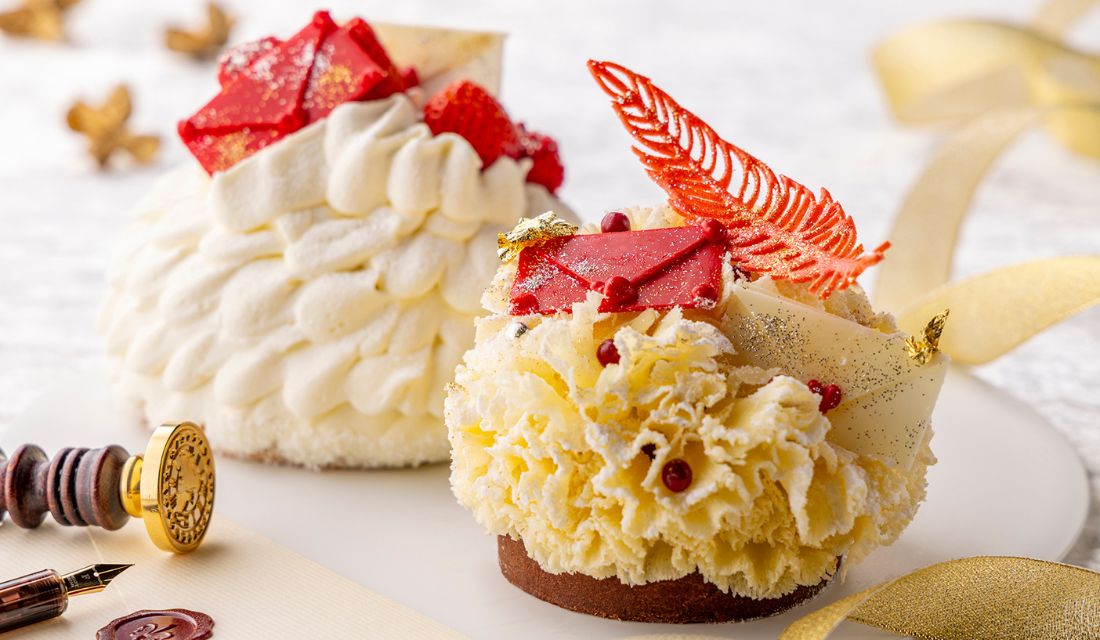 今年のクリスマスのテーマである「Dear You ~大切な人へのメッセージ~」に合わせ、羽毛筆を模したラズベリーチュイルや手紙をモチーフにしたチョコレートがトップを飾ります。
