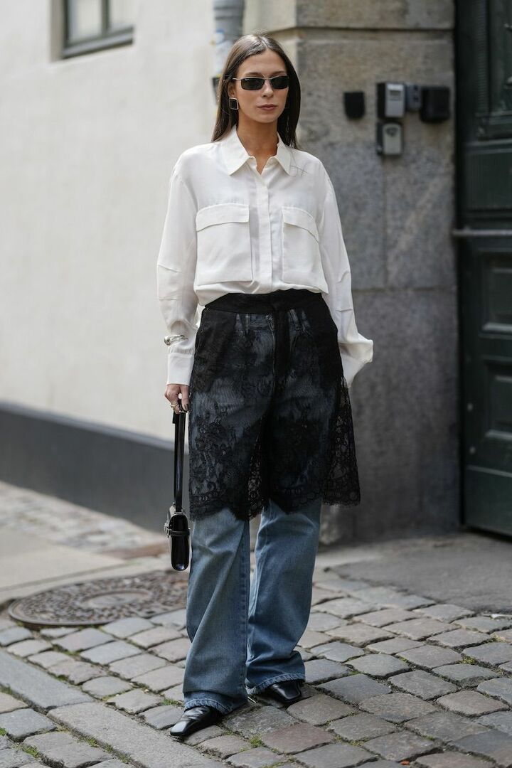 スカートを重ね穿きして、白シャツとブルーデニムパンツの王道きれいめカジュアルを今っぽくアップデート。黒のレーススカートで引き締めをクリアしながら、透ける素材によって白とブルーの軽やかさをそのままキープ。