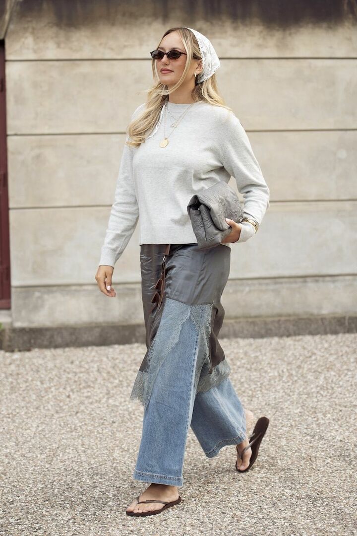 トップグレーのニットプルオーバーとアイスブルージーンズのカジュアルを軸にしたら、白のヘッドレーススカーフ、グレーのレーススカートを重ねてトレンドらしくアレンジ。デニムパンツとビーチサンダルのおかげで抜け感を両立できるから、気張って見えず好都合。