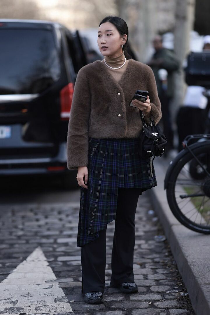 ベージュとブラウンのトップスコーディネートと黒パンツを掛け合わせ、上品さを意識。これだけでも完成しますが、アシンメトリーのチェック柄スカートを重ねるといっきにトレンド感のある装いに。黒パンツに馴染む、ダークトーンのスカートを指名するのがバランスアップのコツ。