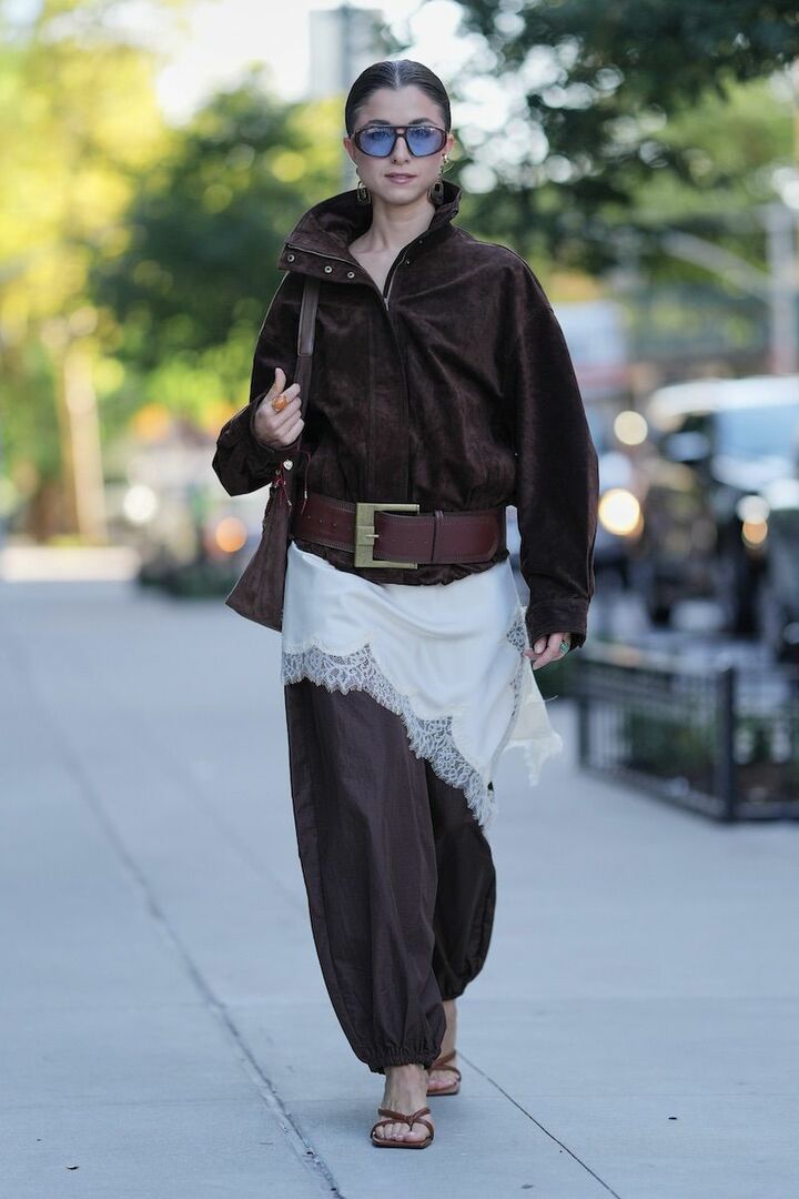 ブラウンでリンクしたブルゾンとワイドパンツは、スエードとシャカシャカ素材の異素材ミックスにして締まりのなさを払拭。センシュアルな白のスリップミニスカートを重ね、穏やかブラウンに軽やかさをトッピング。さらにインパクト大な太ベルトをプラスして洒落感を倍増。