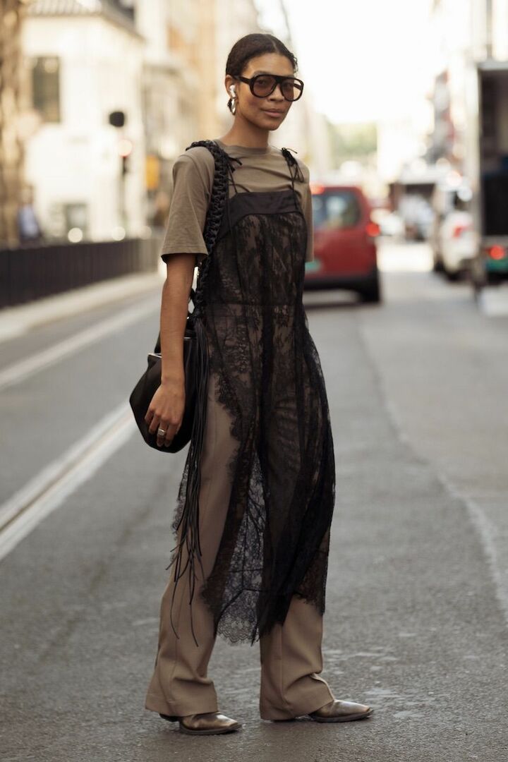 重ねる前提で作られた、総レースのワンピースもコーディネートの起爆剤としてワードローブに備えておきたいです。黒レースのキャミソールワンピースをプラスし、ベージュのTシャツとパンツのシンプルコーディネートをドレッシーに味付け。
