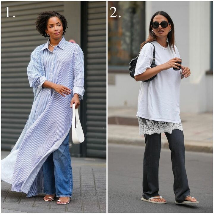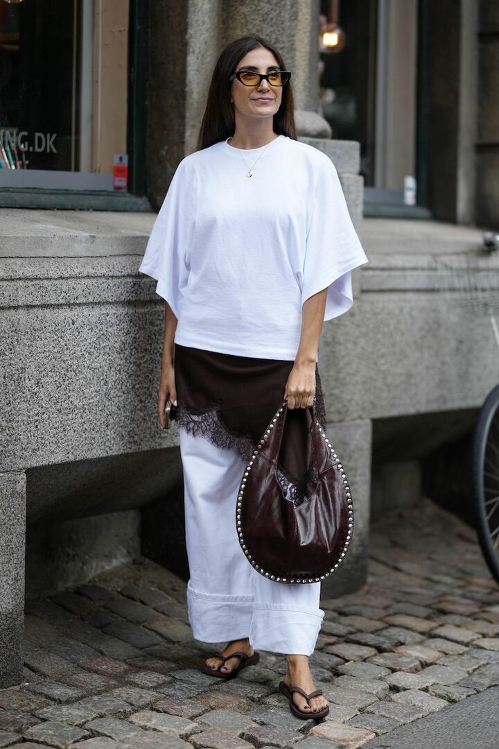 ビッグTシャツとスラックス、ビーチサンダルで作るカジュアルスタイルは、レーススカートを仕込めば物足りなさを解消でき、お洒落心も満たせます。モノトーン構成なら大人らしさが上昇。