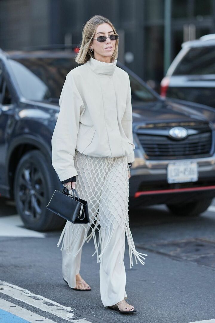 オールホワイトコーディネートは、シャカシャカ素材のブルゾンで軽快さを上乗せ。パンツの上に裾がフリンジになったフィッシュネットスカートをレイヤードすれば、躍動感が生まれて立体的に着地します。