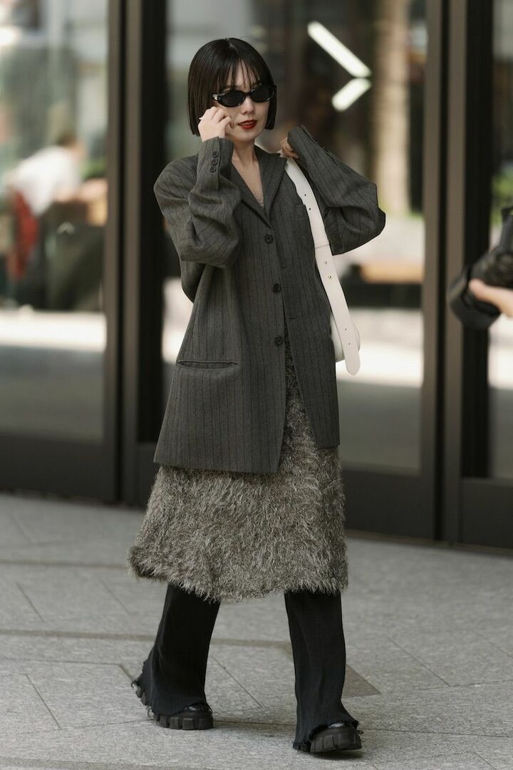 ロング丈のジャケットとミモレ丈のフェザーワンピース、チャンキーソールのシューズのように、重心が下にくるように設定すると格好よさが盛り上がります。モノトーン配色にしたこともモダンさに貢献。