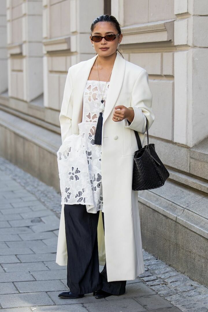 白のレースワンピースと黒ワイドパンツを重ね、レースの模様がくっきり浮かび上がるように。ワンピースと同じ色のロングコートを重ね奥行きを作りつつ、Iラインを強調してバランスアップをクリア。