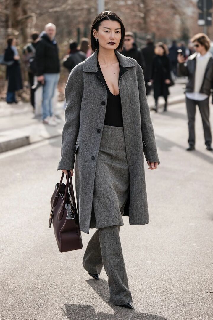 テクニック要らずで良バランスにまとまる、パンツとスカートのレイヤードセット。さらにコートも揃いになったトリオなら、楽して着映えが実現。黒とグレーのスタイリッシュな配色には、マチュアなバーガンディバッグがお似合い。