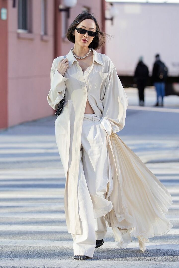 シャツワンピースとワイドパンツを重ねても膨張しないのは、ワンピースのボタンをひとつだけ留め、裾が動くように調整しているから。さらにお腹周りに三角ゾーンを出現させ、ホワイトコーディネートのキレのよさを加速。