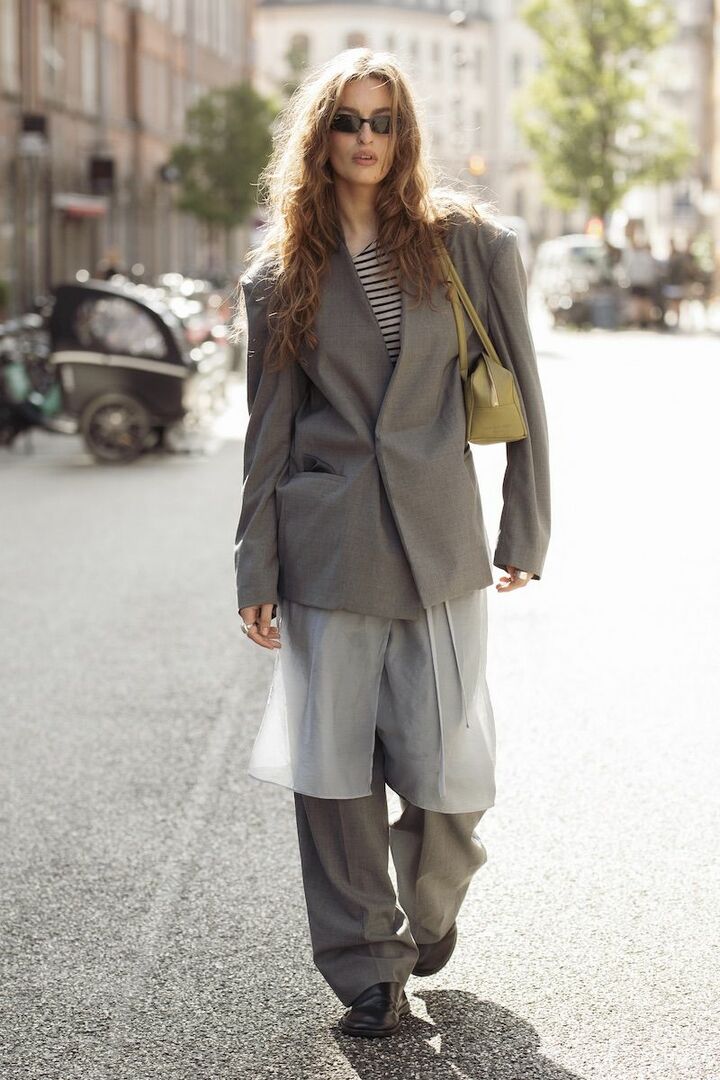 知的さ漂うグレーのスーツ。オフの日ならではの着こなしを楽しむなら、ボーダーカットソーと白のシアースカートを重ね着。ロング丈のジャケット、膝丈のスカートが重心を下げるから、スタイリッシュな印象を実現できます。