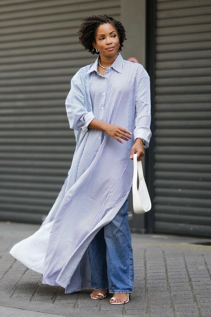 ブルーのストライプシャツワンピースをまとって、清潔感を演出。ブルーデニムパンツと白の小物をプラスし、クリーンさを引き上げ。涼感配色には、ひんやり感のあるシルバージュエリーがマッチします。