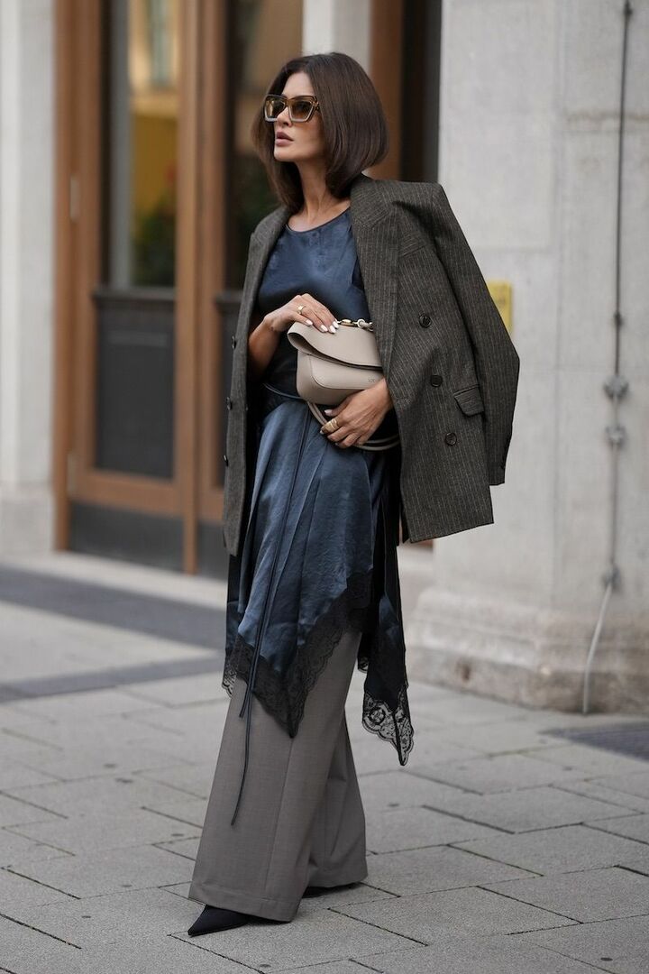 ワイドパンツと合わせてももたつかないように、裾に動きのあるフレアワンピースを採用。ツヤ素材とレーストリムが軽やかさを演出してくれます。仕上げにオーバーサイズジャケットをばさっと肩掛けし、こなれ感をアピール。