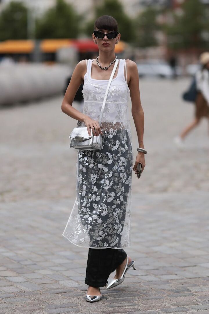 白タンクトップと黒パンツのシンプルワンツーに、白のシアーワンピースを重ねて奥行きを作りながらお洒落心を刺激。バッグとパンプスはワンピースの色から拾ったシルバーを指名し、キレのよさをプラス。