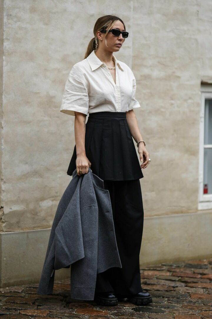 あとからパンツを足す、という発想もあり。白の半袖シャツと黒ミニプリーツスカートだと、どうしても学生感が強く出て、大人が着こなすには難しい印象… そこで黒パンツを忍ばせる簡単テクニックを使ってモダンにアップデート。ワイドシルエットなら重厚感が生まれ、モード感が加速します。