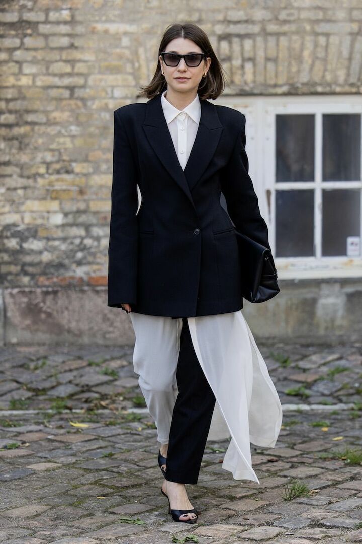ジャケットのくびれた形を引き立てるべく、パンツはスリムな形をセレクト。インには風をはらむ白シャツワンピースを迎え、躍動感と奥行きを生み出せばモノトーンがドラマティックに仕上がります。