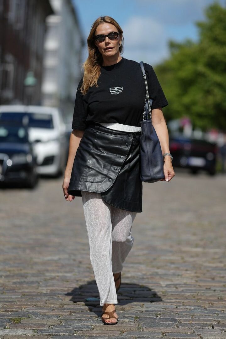 ぴりっとスパイシーな黒のレザーミニスカート、エアリーな白のレースパンツのように、対になる色と素材を重ねモノトーンを表情豊かに。凝ったレイヤードスタイルなので、トップスは親しみやすいTシャツをセレクト。