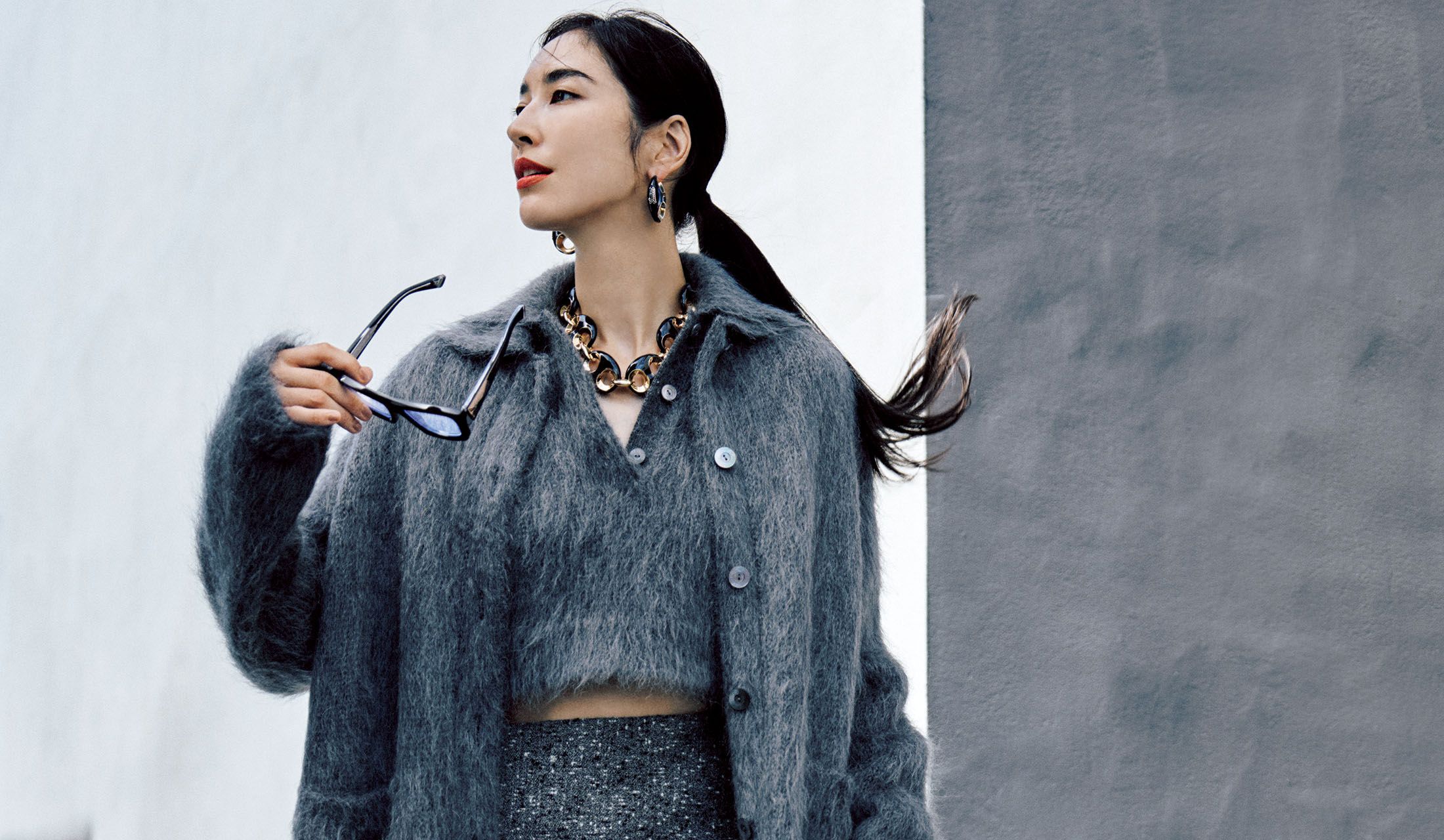モードな華やぎを演出する「グッチ」の最旬グレーは異素材のコントラストが異彩を放って。