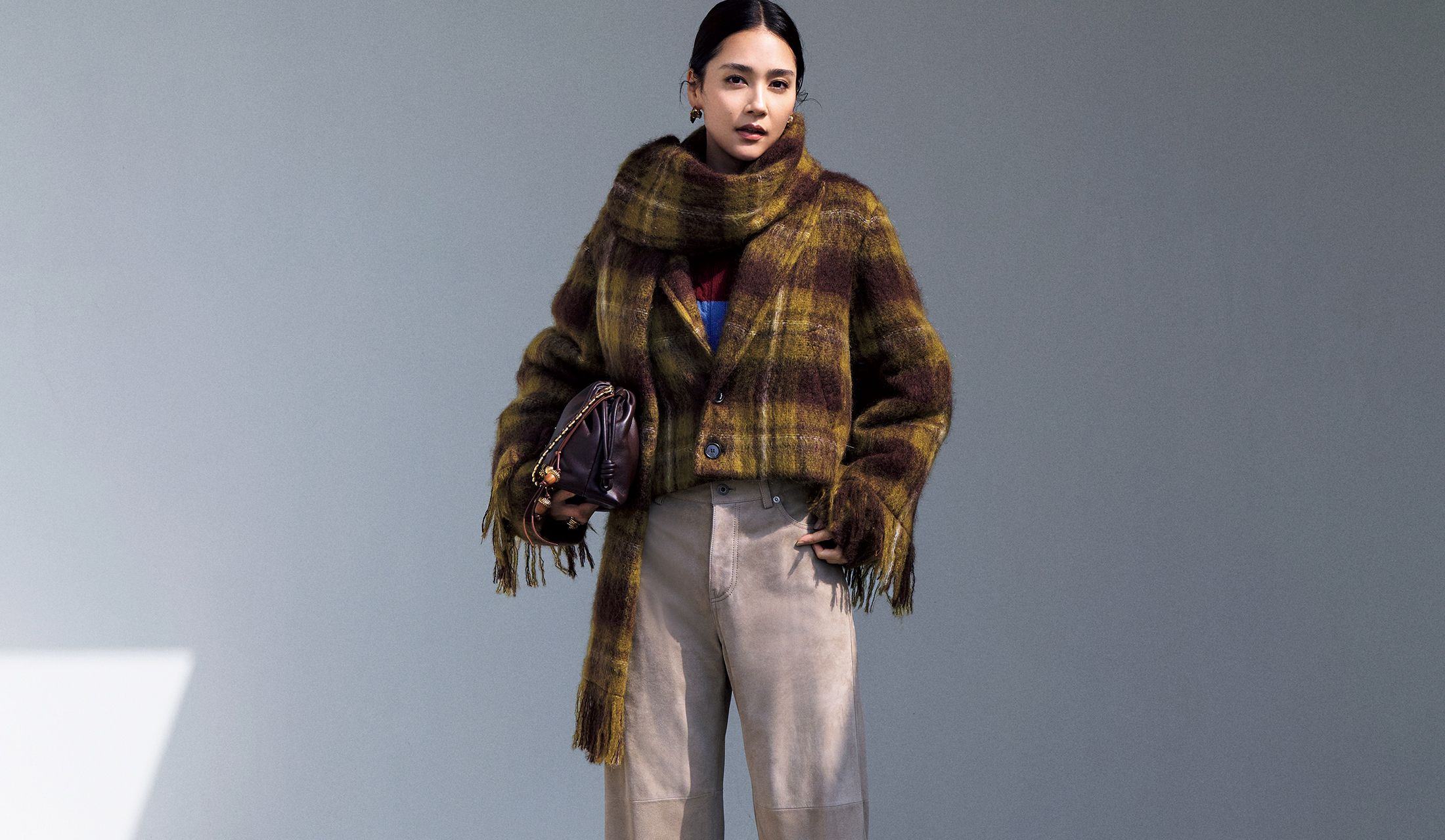 ブルゾンライクなコンパクト丈は、コートの新潮流。ヘアリーなモヘア混素材や手作業で仕上げた長めのフリンジ、取り外し可能なたっぷりと幅広なストール…と今らしくプレイフルなエレメンツとマッチして、オーセンティックなチェック柄が旬モードな印象に。