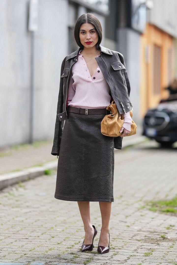 ふんわりと柔らかなピンクポロニットを大人らしく着こなすべく、レザー素材のジャケットとスカートをミックス。ビターなブラウンなら黒ほど強くならず、ちょうどいいスパイスを効かせることができます。ジャケットはラフに肩掛けし、緊張感を解けばあか抜け確実。