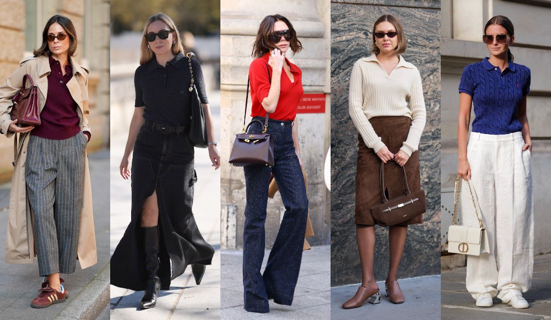 ライトベージュのポロニットを軸にして、グレイッシュな色味で洗練が宿るトープカラーをミックス。穏やかな色合わせながらも、肩掛けニットの小技やツヤパンツが効いてこなれ感が漂っています。黒のバッグで引き締めればパーフェクト。