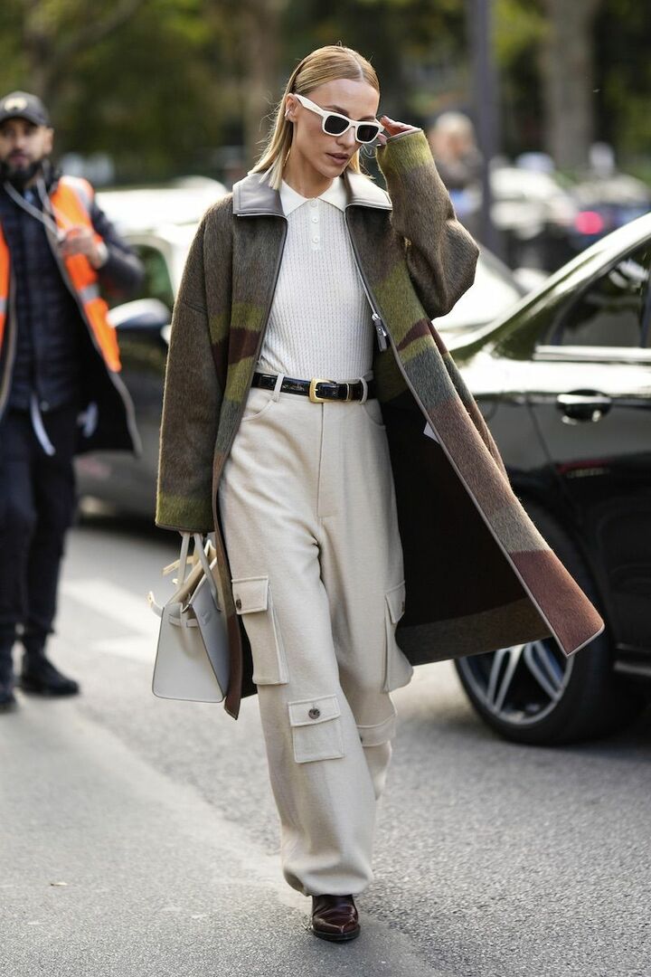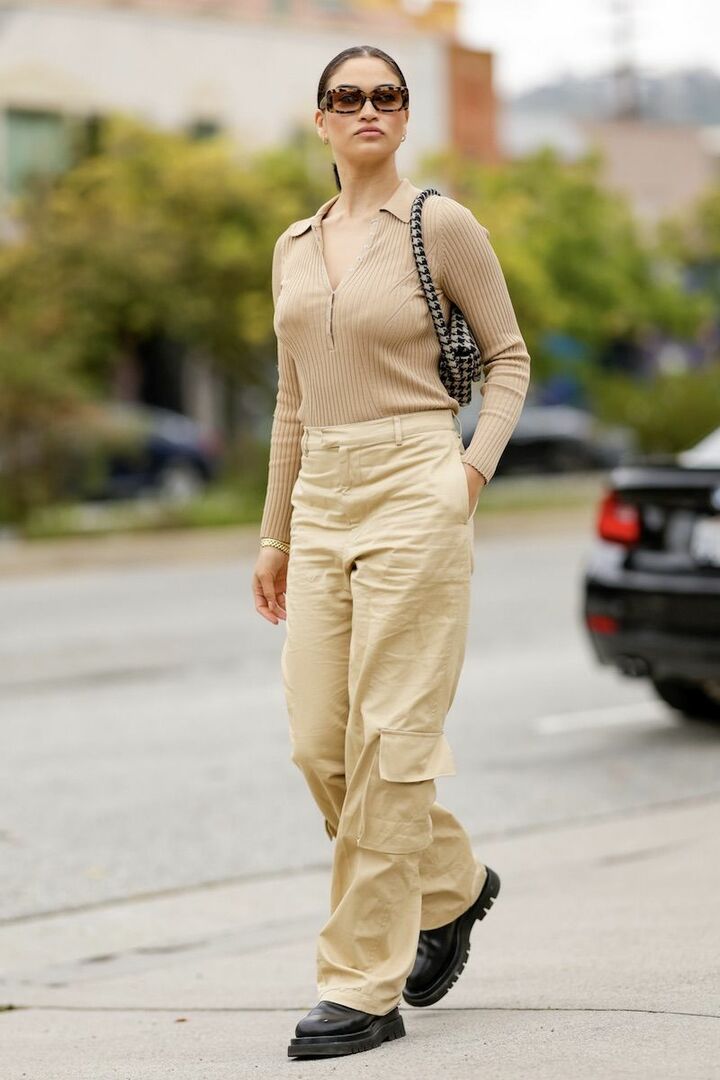 ざっくりボタンを外したポロニットに、カーゴパンツを合わせアクティブさを漂わせたモデルのシャニーナ・シャイク。ベージュを基調として、黒小物で締めると大人らしさをキープできます。バッグの千鳥格子模様が立体感に作用。
